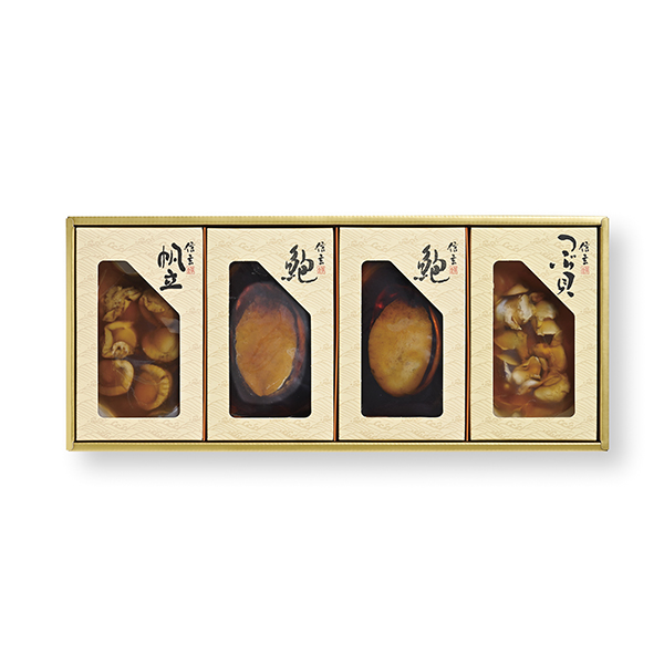 あわび、帆立、つぶ貝の煮貝を詰め合わせました。素材や水にこだわり、薄口醤油で煮上げました。