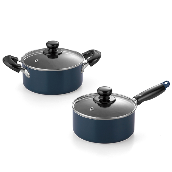内面はフッ素樹脂加工で、焦げ付きにくく、汚れが落としやすい片手鍋と両手鍋のセットです。