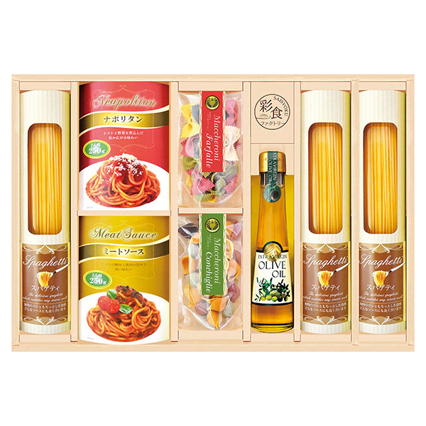 ●商品:スパゲティ130g×3、自然色パスタ(コンキリエ60g・ファルファーレ40g各1)、パスタソース(ナポリタン250g・ミートソース250g各1)、エクストラバージンオリーブオイル100g×1