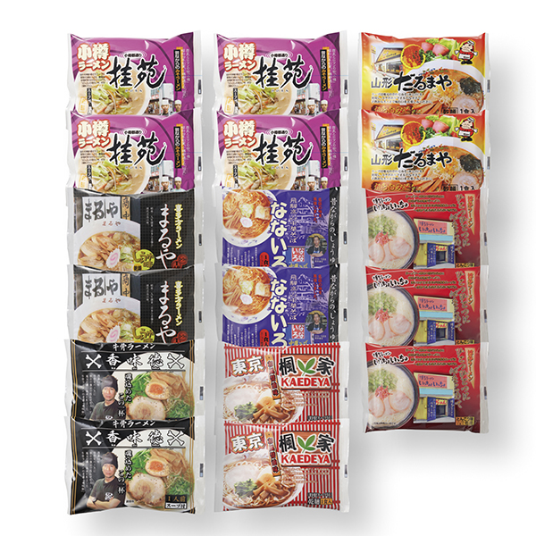 ●商品:小樽桂苑(味噌/乾麺80g×1、スープ付)×4、山形だるまや(からし味噌/乾麺80g×1、スープ付)・喜多方まるや(醤油/乾麺80g×1、スープ付)・東京楓家(醤油/乾麺80g×1、スープ付)・高山なないろ(醤油/乾麺80g×1、スープ付)・鳥取香味徳(醤油/乾麺80g×1、スープ付)各2、博多いっちょいっちょ(とんこつ/乾麺80g×1、スープ付)×3