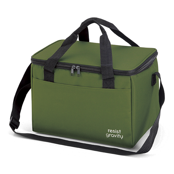 カーキ色の生地を使ったクーラーバッグです。500mlのペットボトルを15本収納できます。